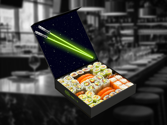Conceptual design of fictional Sushi Shop boxes, imagining colllaborations between the food brand and popular film or TV series franchises.